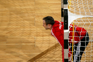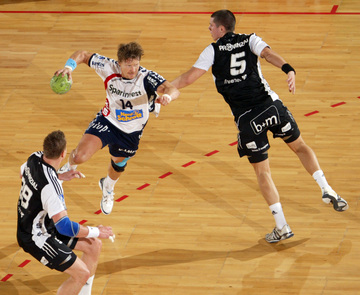 Kim Andersson attackiert Alen Muratovic. Vor dem Spiel. Nikola Karabatic. Johnny Jensen und Filip Jicha.