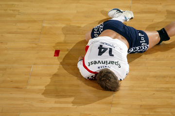 Jensen am Boden. Die Flensburger Bank. SG-Co-Trainer Per Carlen. Lasse Boesen und Marcus Ahlm.