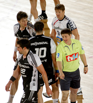 Michael V. Knudsen nach seiner roten Karte. Ljubomir Vranjes und Nikola Karabatic. Doppelte Zeitstrafe. Diskussion.