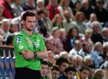 | TBV-Trainer Markus Baur. | Sebastian Preiß und Stefan Lövgren. | Noka und Mirjana Serdarusic. | Rolf Hermann und Filip Jicha. | |||