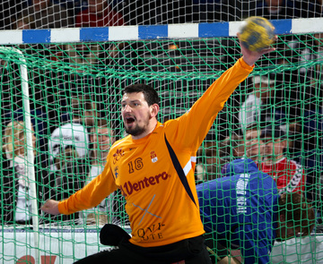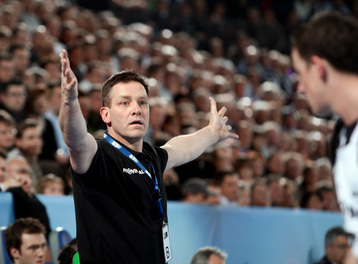 | Olafur Stefansson beim Strafwurf. | Arpad Sterbik. | Warmmachen. | Warmmachen. | |||