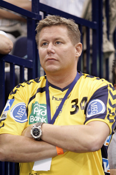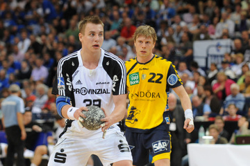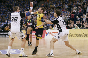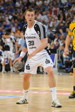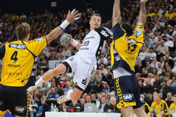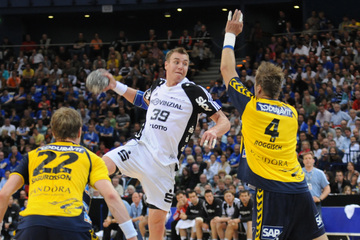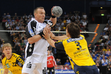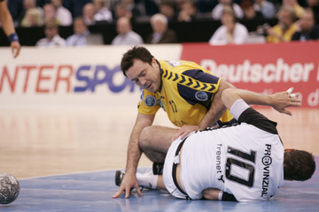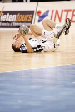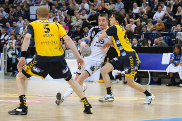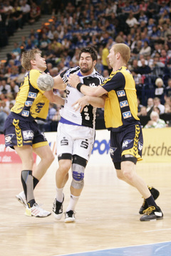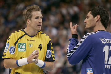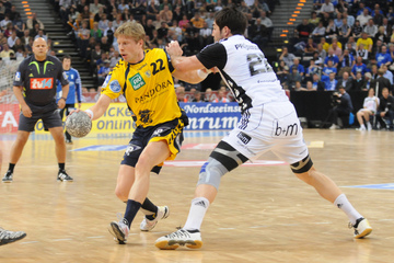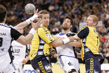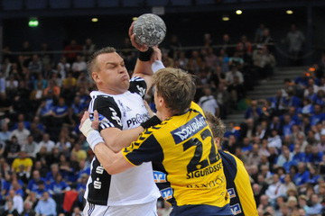 Nikola Karabatic. Harte Arbeit. RNL-Gesellschafter Jesper Nielsen. Kampf um den Ball.