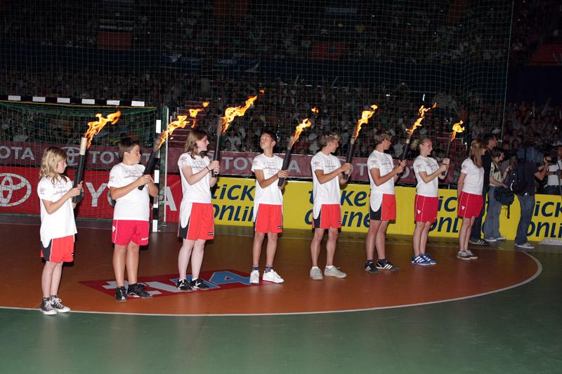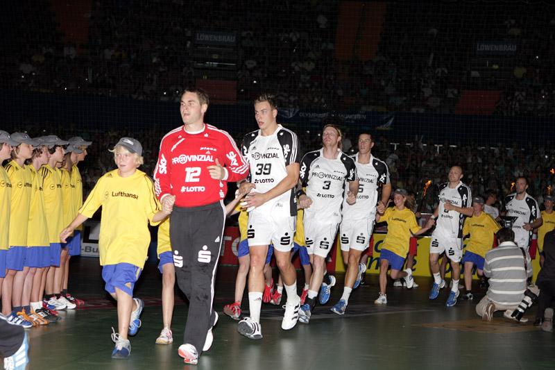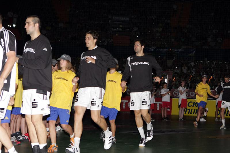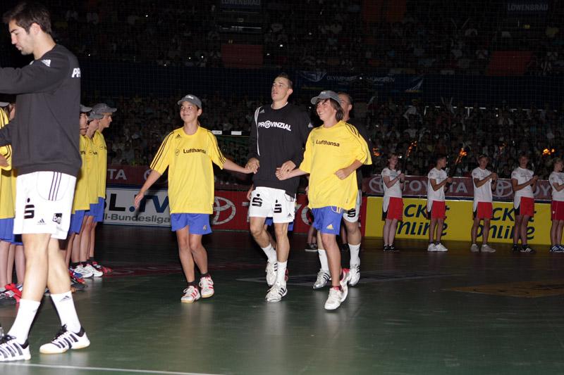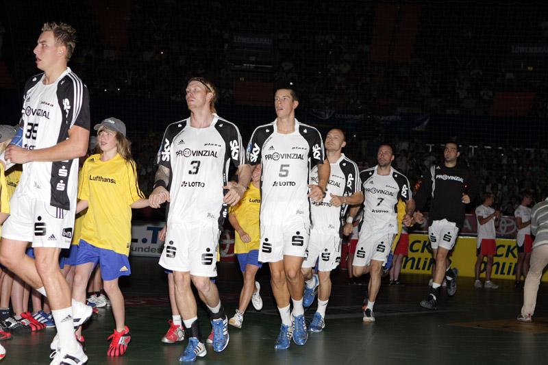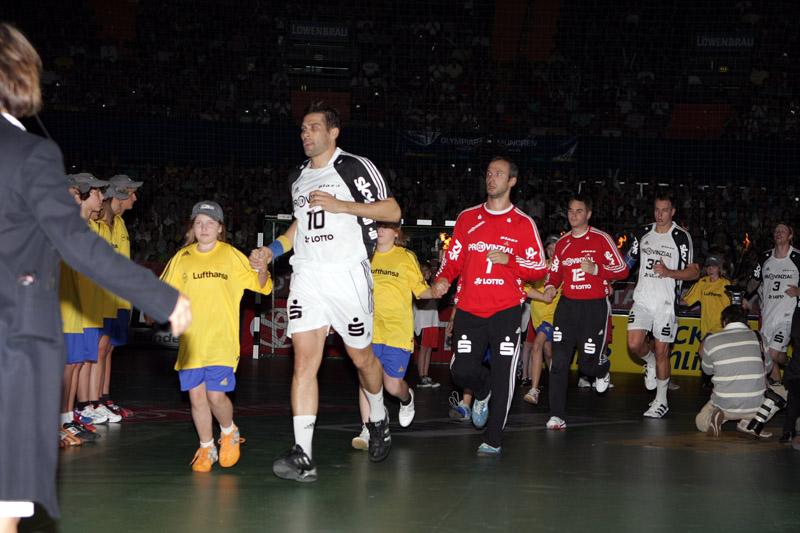 Supercup 2008: Einlauf der Zebras. Supercup 2008: Einlauf der Zebras. Supercup 2008: Alfred Gislason. Supercup 2008: HBL-Vorstand Rainer Witte beglückwünscht Thierry Omeyer zum Olympiasieg.