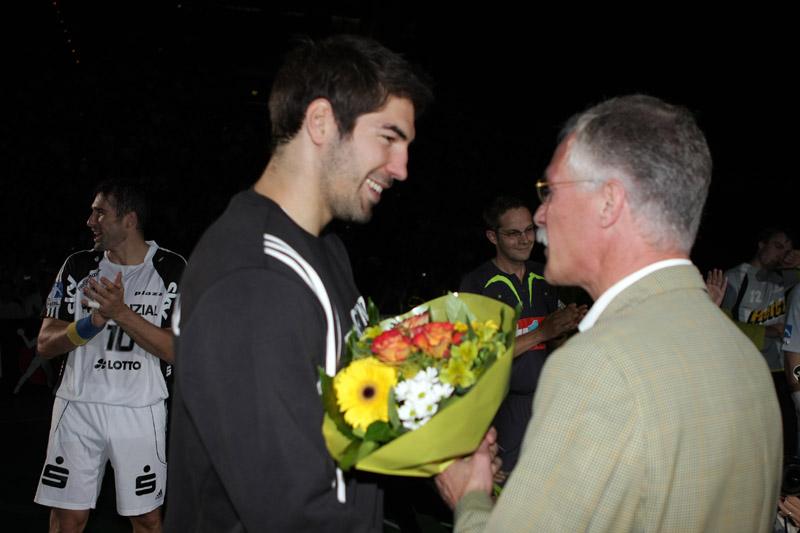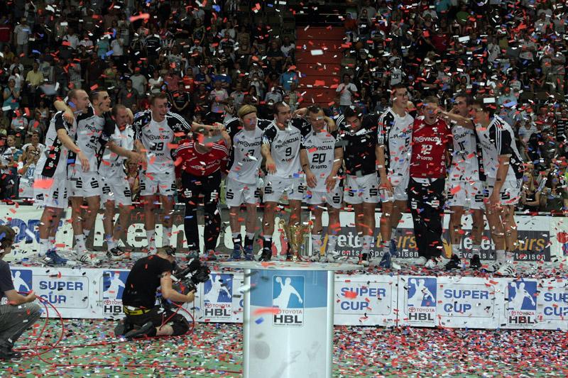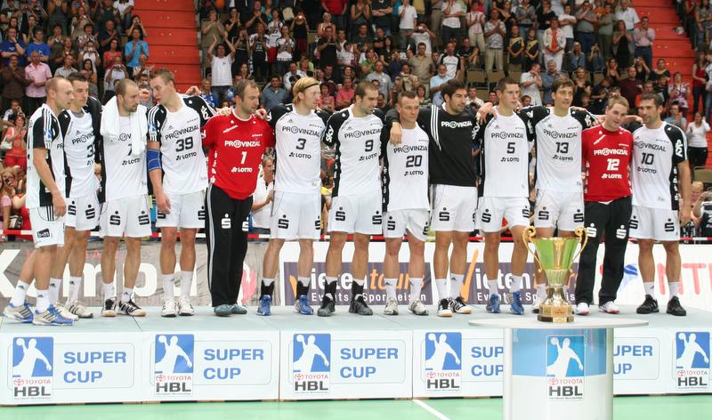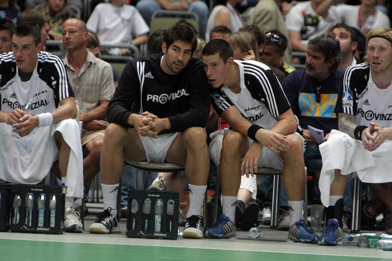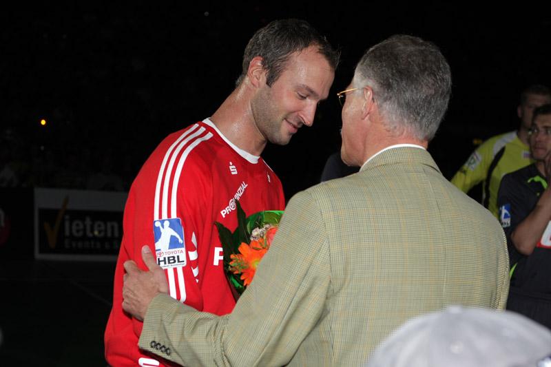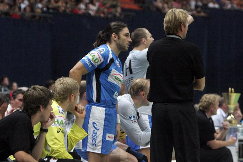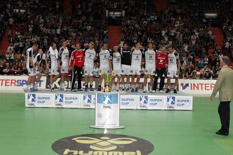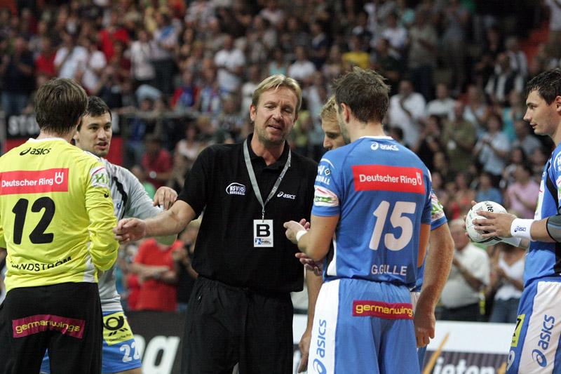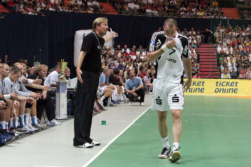 Supercup 2008: HBL-Vorstand Rainer Witte beglückwünscht Nikola Karabatic zum Olympiasieg. Supercup 2008: HSV-Trainer Martin Schwalb. Supercup 2008: Vid Kavticnik. Supercup 2008: Hendrik Lundström.