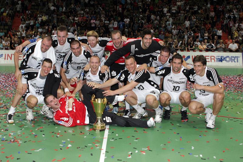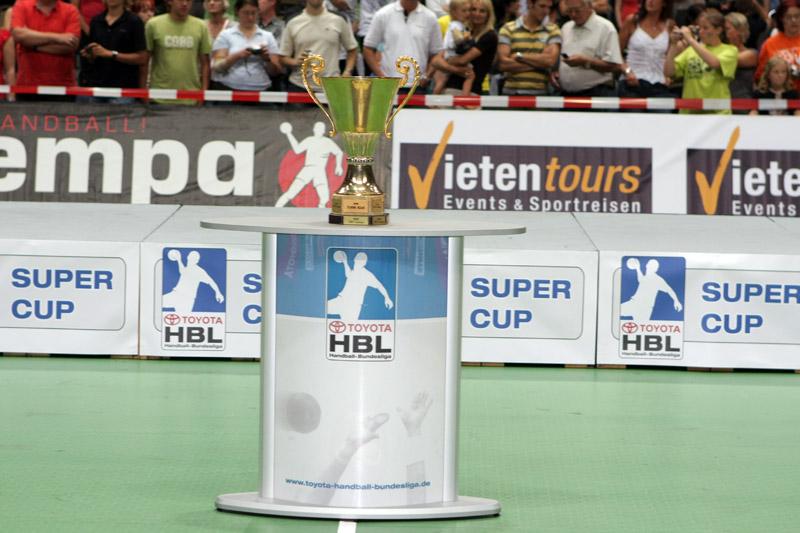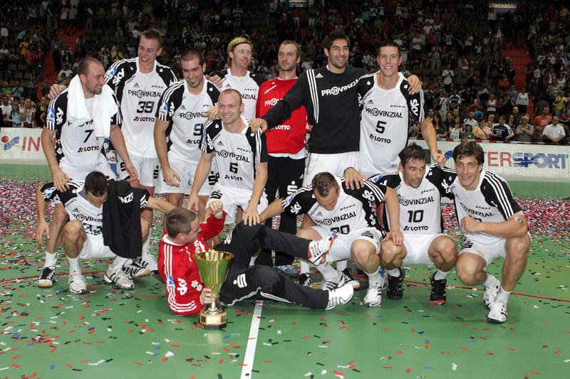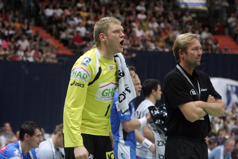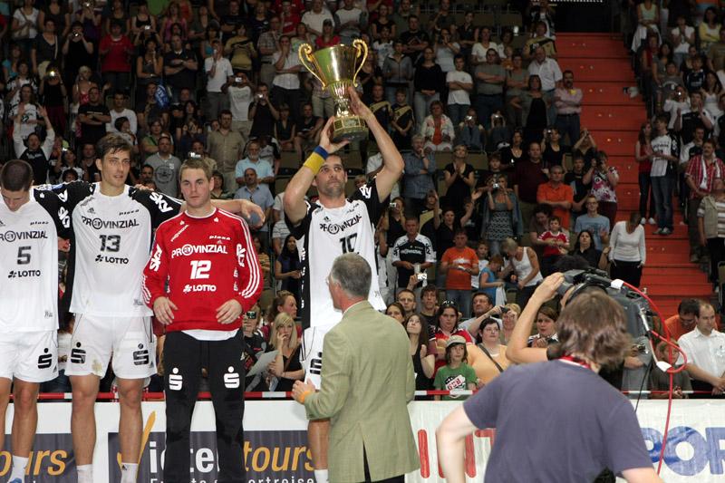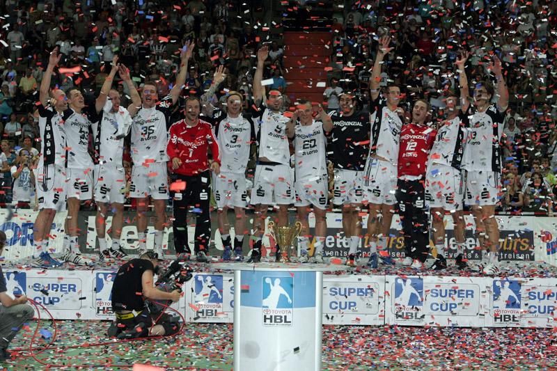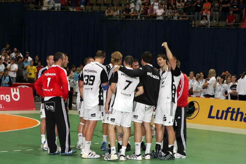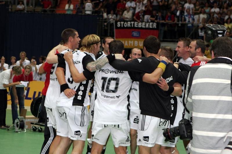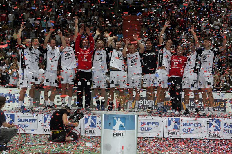 Supercup 2008: HBL-Vorstand Rainer Witte beglückwünscht Nikola Karabatic zum Olympiasieg. Supercup 2008: HSV-Trainer Martin Schwalb. Supercup 2008: Vid Kavticnik. Supercup 2008: Hendrik Lundström.