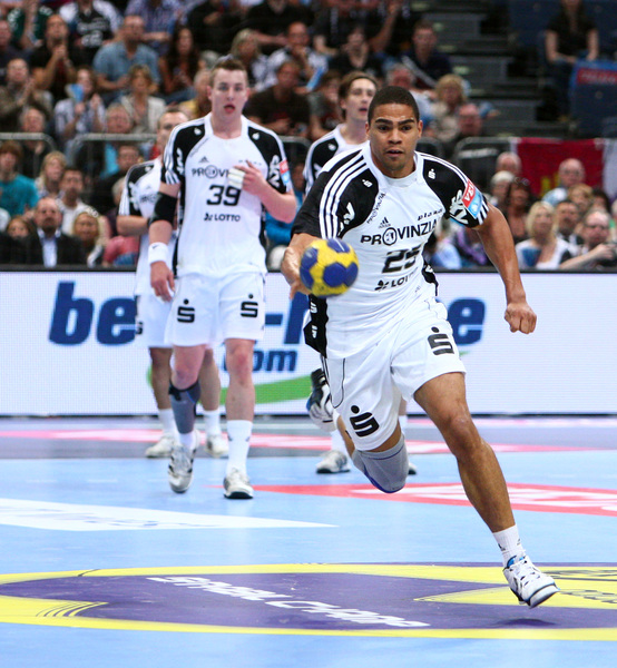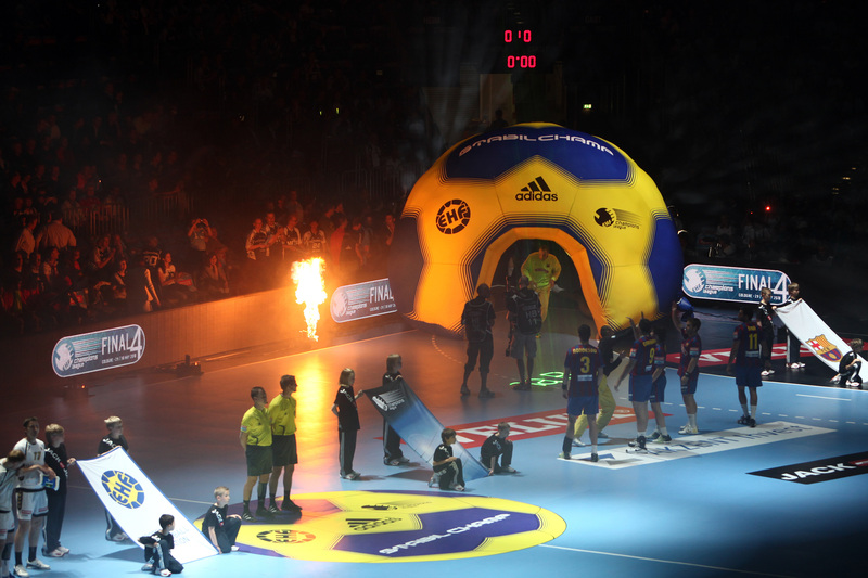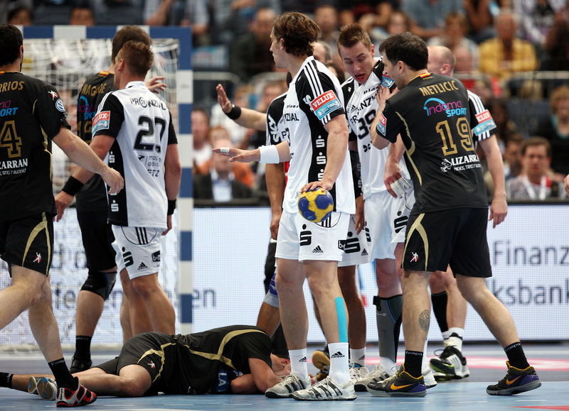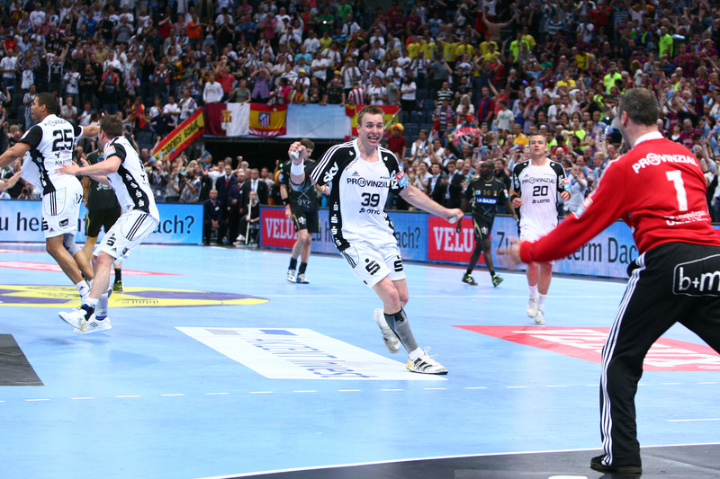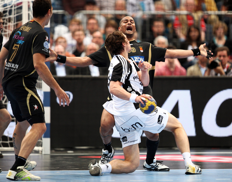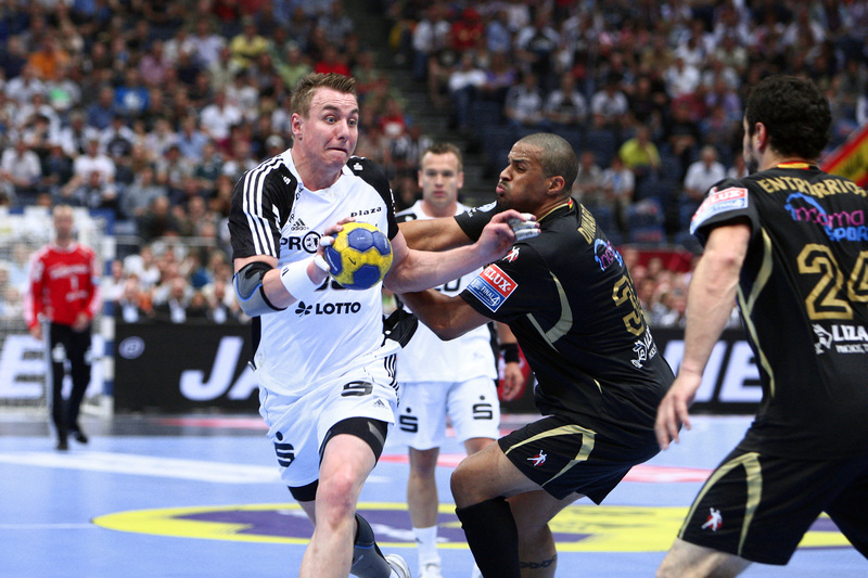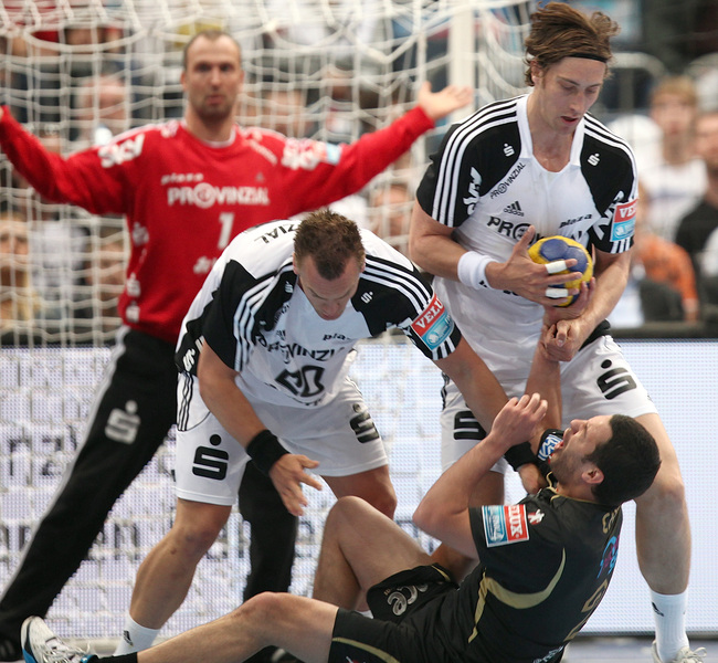 | EHF-Generalsektretär Wiederer und EHF-Präsident Lian. | Die Lanxess arena in Köln. | Einlauf der Teams. | Didier Dinart attackiert Christian Zeitz. | |||