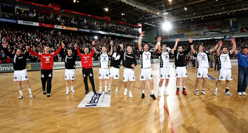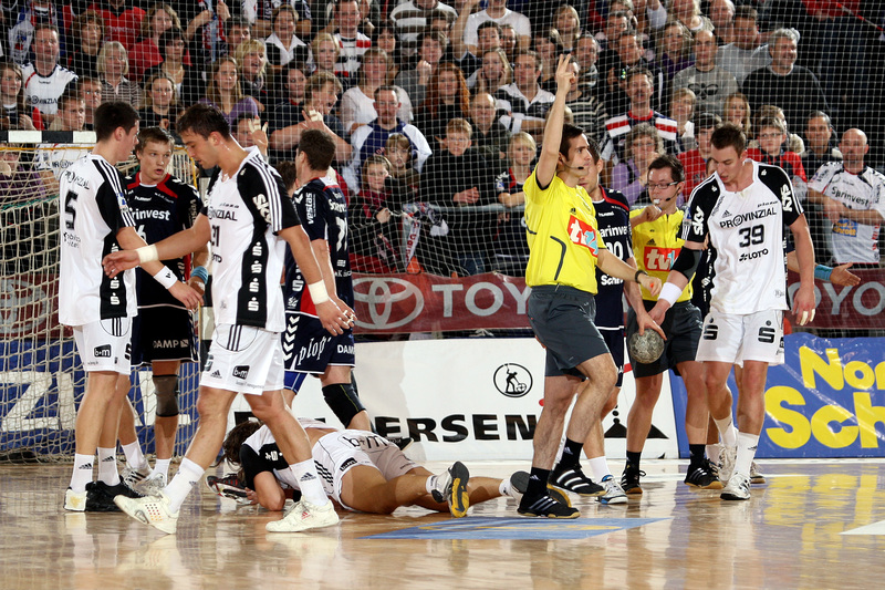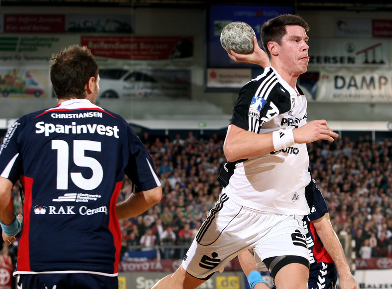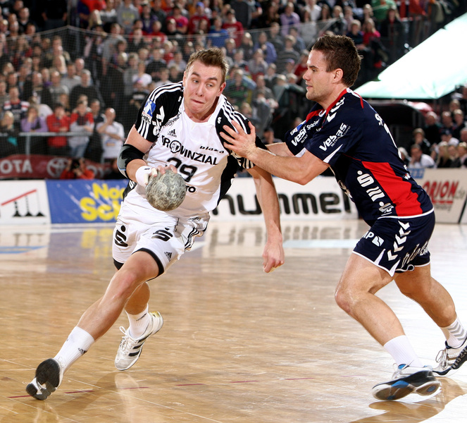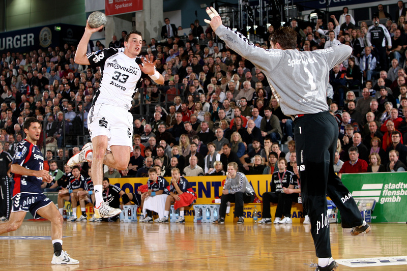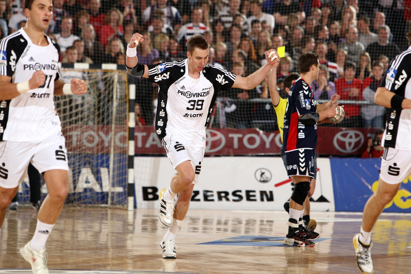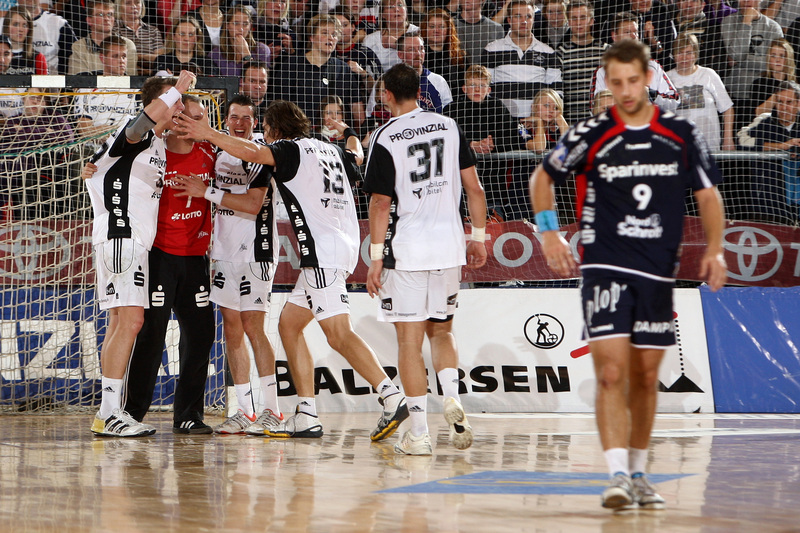 | Die Kieler Deckung packt zu. | Lars Christiansen vs. Thierry Omeyer. | Vor dem Spiel. | Spielszene. | |||