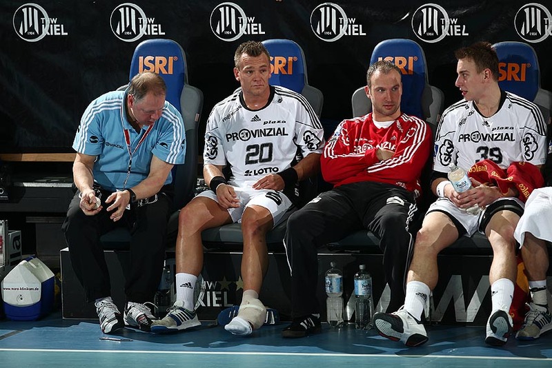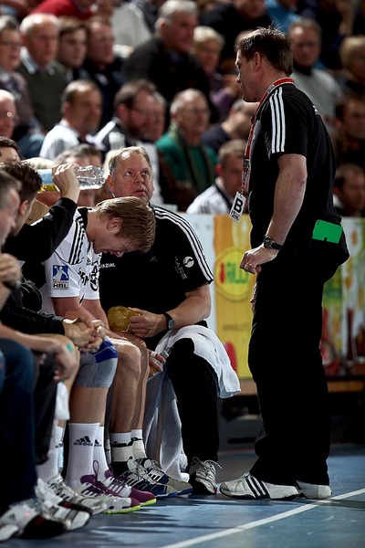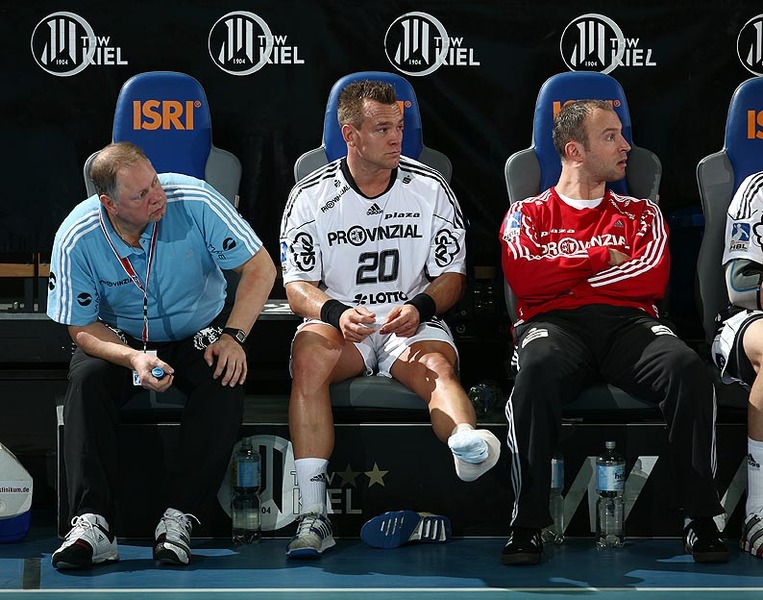 Andreas Palicka. Pause. Hannovers Trainer Aron Kristjansson. Die Kieler Bank.