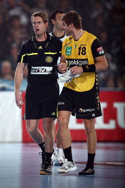 Börge Lund. Bjarne Myrhol im Gespräch mit dem Schiri. Thierry Omeyer. Thierry Omeyer.