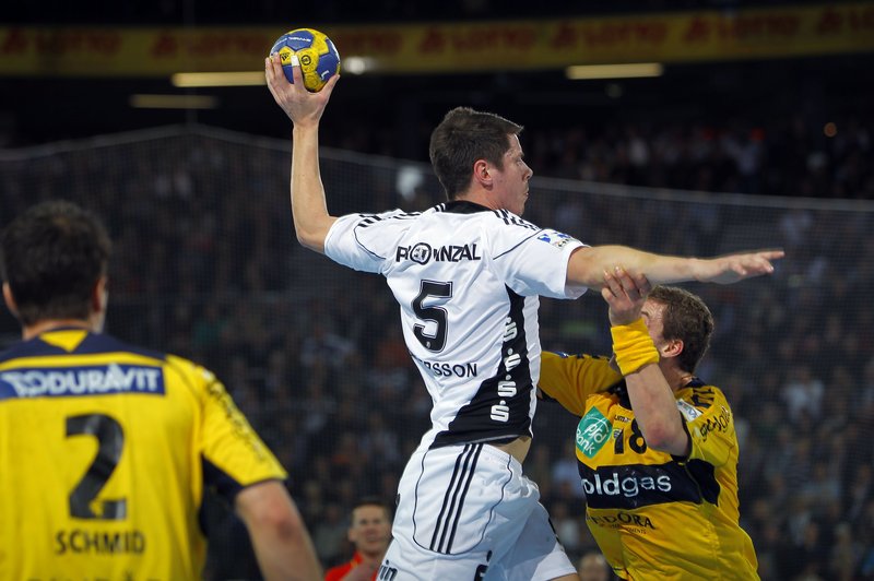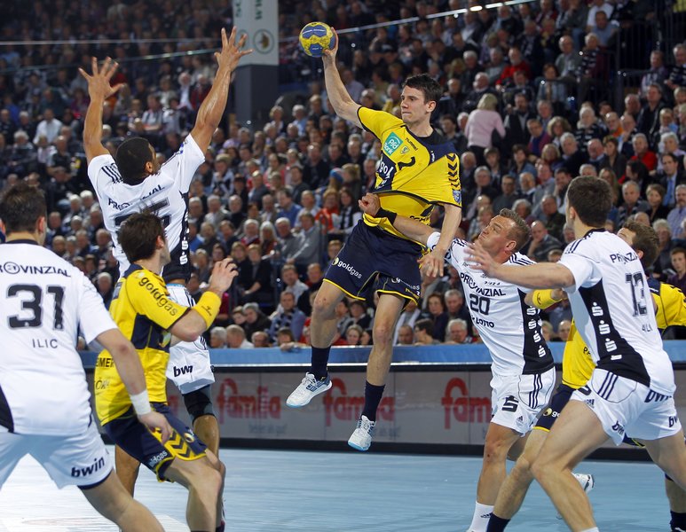 | Marcus Ahlm. | Momir Ilic gegen Goran Stojanovic. | Kieler Deckungsarbeit. | Karol Bielecki. | |||