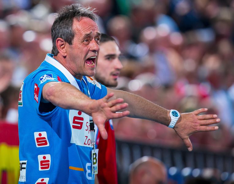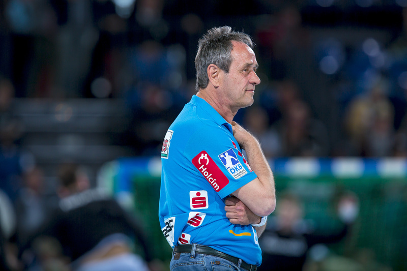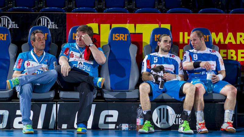 Balingens Trainer Dr. Rolf Brack. Balingens Bank. Auf geht's zur zweiten Halbzeit. Aron Palmarsson.