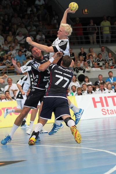 | Supercup-Sieger 2012! | Marcus Ahlm wird von Tobias Karlsson und Thomas Mogensen attackiert. | Christian Zeitz. | Abwehrarbeit. | |||